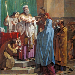 கரங்களில் குழந்தை, கண்களில் மீட்பு. பின்னும் மரியாளிடம் ஒரு தீர்க்கதரிசனமாக உமது உள்ளத்தையும் ஒரு வாள் ஊடுருவிப் பாயும் என்று கூறுகின்றார்.